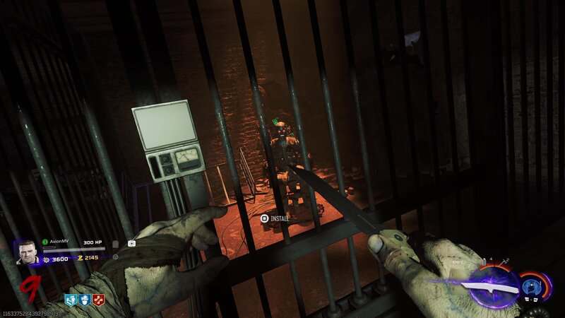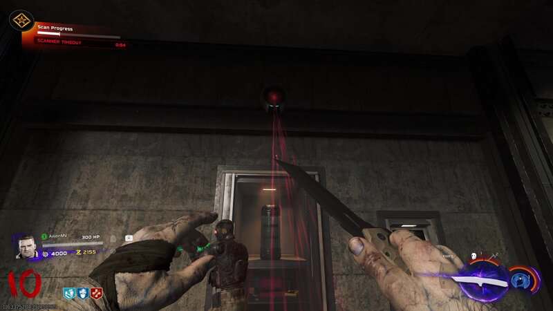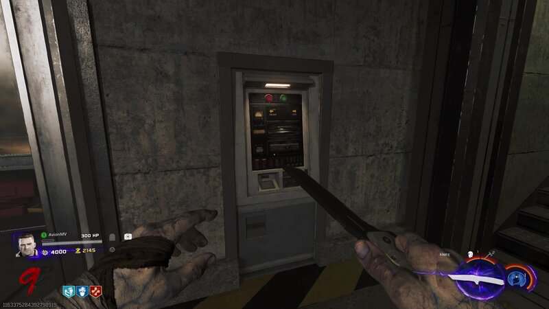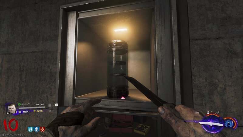 Interagissez avec le panneau et un scanner rouge sera activé, créant un cercle rouge au sol. Vous devrez rester debout dans le cercle pendant environ 20 secondes pour remplir un compteur. Vous aurez 60 secondes pour remplir le compteur. Si vous quittez le cercle ou si un zombie entre dans le cercle, le compteur cessera de se remplir. Si vous vous éloignez trop du cercle ou si le temps est écoulé, le scanner s'éteindra et vous devrez attendre le tour suivant pour réessayer. Lorsque vous remplissez le compteur en vous tenant debout devant le scanner, le récipient en verre s'ouvrira et vous pourrez récupérer le baril d'éther.