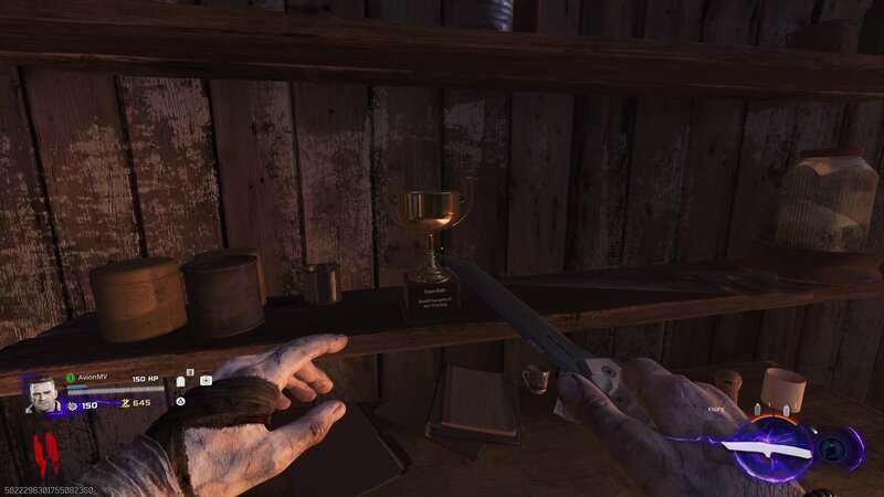 L’œuf de Pâques lançant une hache se trouve au lac Blackwater. Allez au hangar dans le coin sud-ouest de la zone, le même petit bâtiment avec une table d'artisanat. Entrez dans la pièce à droite de la table et vous trouverez un petit trophée sur une étagère. Interagissez avec lui et il émettra une petite lueur et un effet sonore se déclenchera. Sortez du hangar et vous trouverez une hache de combat dans une petite souche. Récupérez cette hache de combat pour démarrer cet œuf de Pâques.