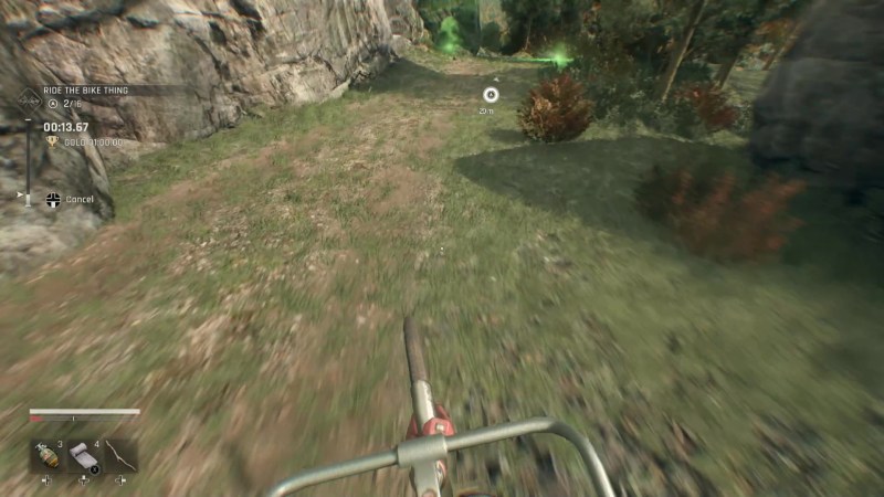 À l'emplacement, vous trouverez un vélo reposant contre un rocher près d'un essai. Interagissez avec le vélo pour commencer le mini-jeu. Vous équiperez automatiquement le vélo et commencerez à monter en avant – un écran de menu de mini-jeu apparaîtra. Acceptez de commencer à rouler et le jeu commencera.