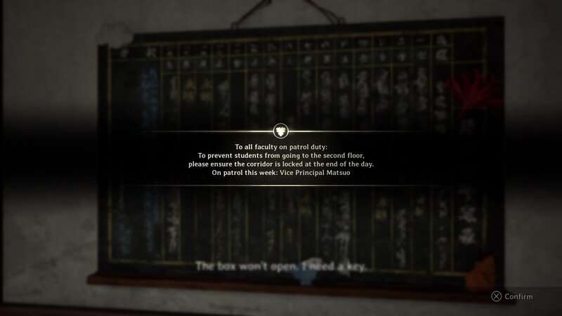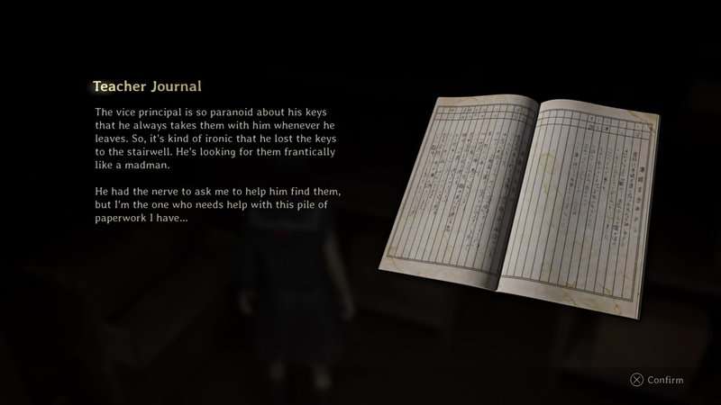 Regardez l'étagère dans le coin de la même pièce pour trouver le Journal des enseignants Document qui dit que le vice-président Matsuo a perdu la clé. Vous devrez trouver un soupçon où la clé s'est terminée. Cet indice et l'emplacement de la clé changeront en fonction de votre difficulté de puzzle.