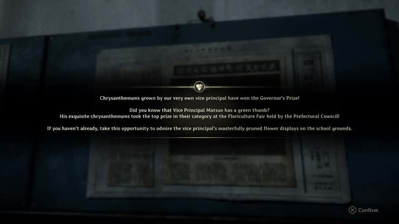 Allez dans la cage d'escalier au nord du salon de l'enseignant. À mi-chemin des escaliers, regardez sur la planche sur le mur droit pour trouver un article de journal couvrant VP Matsuo. L'article discute de son lit de fleurs de chrysanthème qui se trouvent dans le terrain de l'école à l'avant de l'école. C'est là que vous trouverez la clé d'escalier 2F du bâtiment principal.