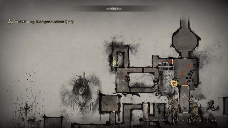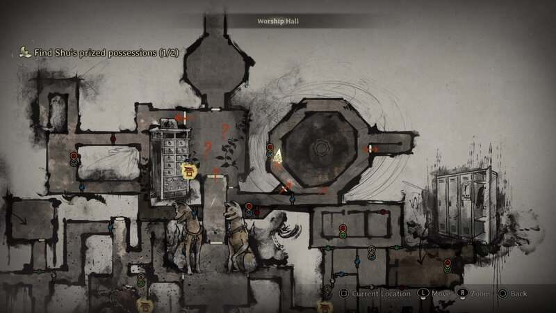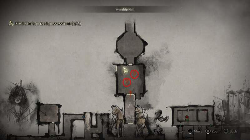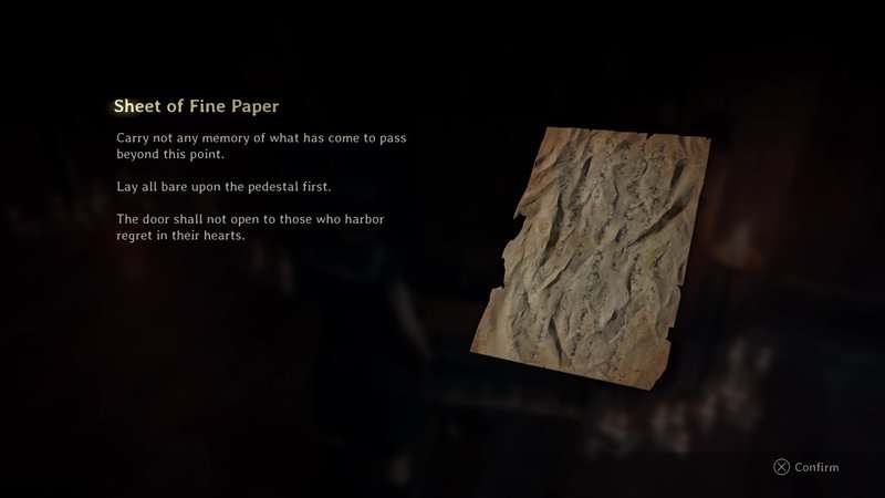 Le puzzle des souvenirs se trouve dans la salle de culte après avoir terminé les ailes est et ouest de la région. Vous débloquerez les grandes portes doubles au centre de la zone pour accéder à une chambre avec 6 autels. Allez dans le coin nord-ouest de la pièce pour trouver le Feuille de papier fin document. Cela vous dira que vous devrez trouver les biens précieux de Shu. Selon votre difficulté de puzzle, le nombre de possessions changera.