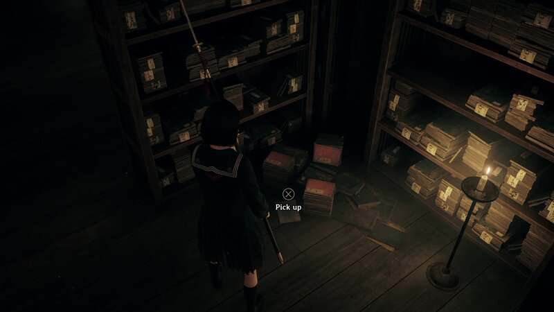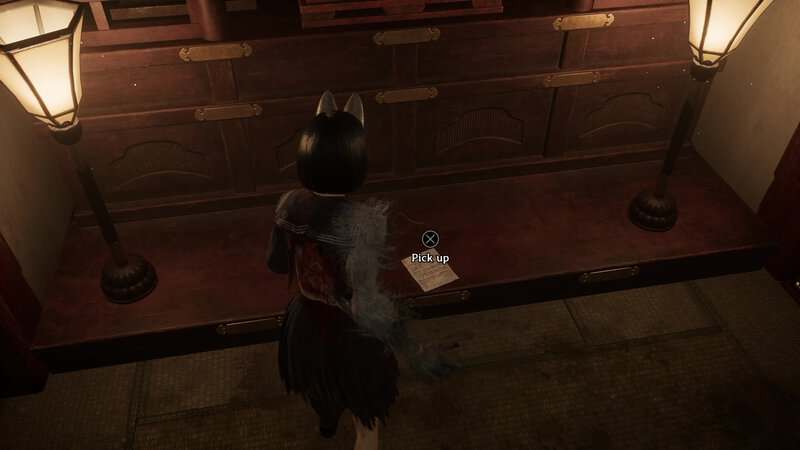 Récupérez le deuxième écusson puis franchissez la porte à droite de la fresque. Une fois la porte franchie, allez vers la droite ou dans la pièce pour trouver une porte Inari-sama. Regardez à gauche de la porte pour trouver ce dernier document sur une étagère.
