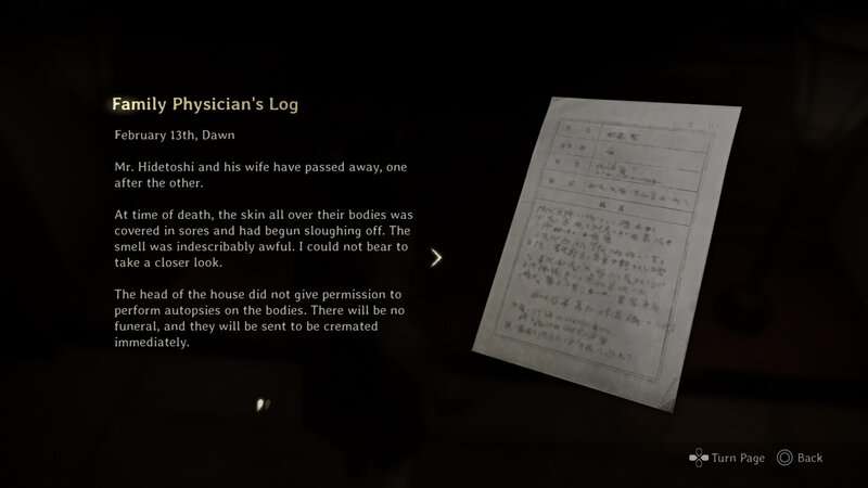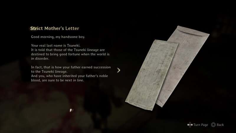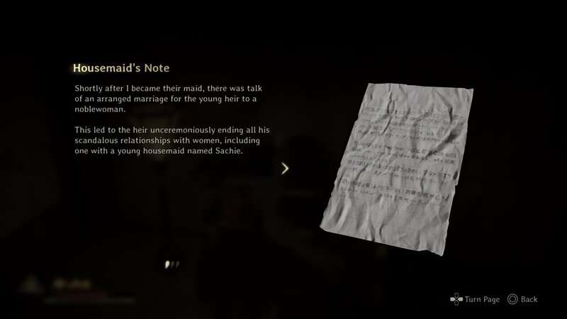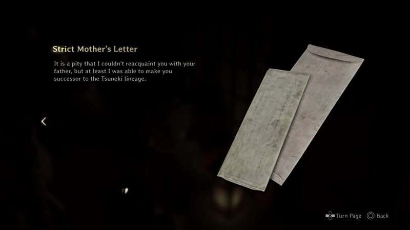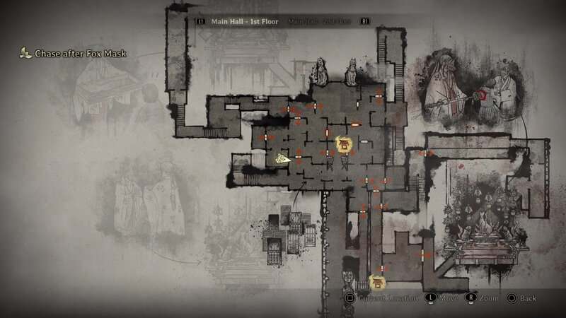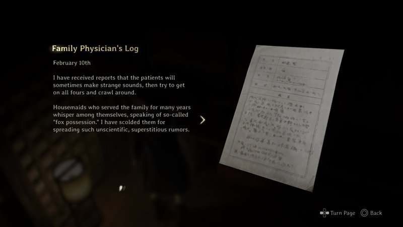 Continuez à travers le hall principal jusqu’à ce que vous obteniez le masque du clan du renard du troisième et dernier rituel. Une fois que vous avez le Masque, retournez vers la porte que vous avez ouverte pour récupérer le document précédent et regardez le mur à gauche. Vous trouverez un mur marqué. Concentrez-vous sur le mur pour le faire fondre et révéler une autre pièce. Vous trouverez ce document dans le coin arrière gauche de cette salle.