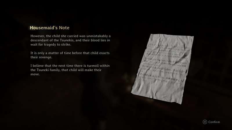 Pour débloquer le succès « La vérité sur la famille Tsunkei », vous devrez trouver toutes les versions de la « Note de la femme de ménage », du « Journal du médecin de famille » et de la « Lettre de la mère stricte ». Il existe 4 documents « Note de la femme de ménage », 5 documents « Journal du médecin de famille » et 5 documents « Lettre stricte de la mère ». Cela signifie que vous devrez trouver un total de 14 documents pour débloquer ce succès. Tous ces documents peuvent être trouvés lors de votre première partie et seront aux mêmes endroits dans New Game+ si vous les avez manqués. Voici un aperçu complet de l'endroit où trouver tous les documents requis pour débloquer le succès « La vérité sur la famille Tsunkei ».