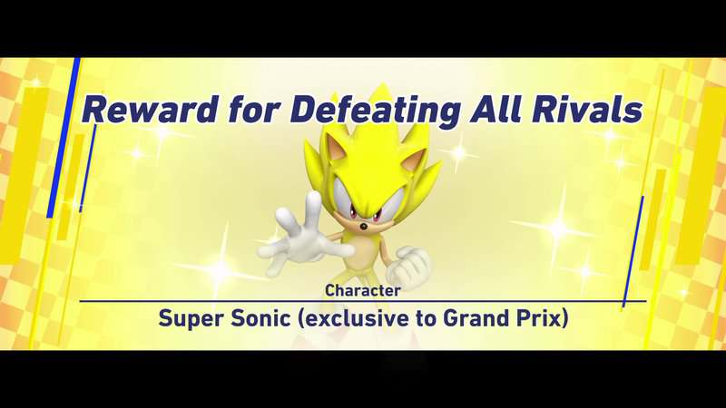Pour déverrouiller le personnage Super Sonic, vous devrez gagner au moins un Grand Prix contre chaque rival de la liste de base du jeu. Chaque fois que vous démarrez un Grand Prix, vous recevrez un rival aléatoire de la distribution de personnages du jeu. Au début de chaque course et pendant la course, vous obtiendrez un dialogue unique entre le personnage que vous choisissez et votre rival. Bien que le personnage qu'ils vous donnent soit aléatoire, vous pouvez appuyer sur le bouton illustré dans le coin supérieur droit de l'écran lors de la sélection de la Grand Prix Cup que vous souhaitez jouer et sélectionnez à la main votre rival. Ce menu vous permet également de suivre le nombre de fois où vous avez battu chaque rival, vous n'aurez donc pas à vous soucier de suivre qui doit encore être coché vous-même.