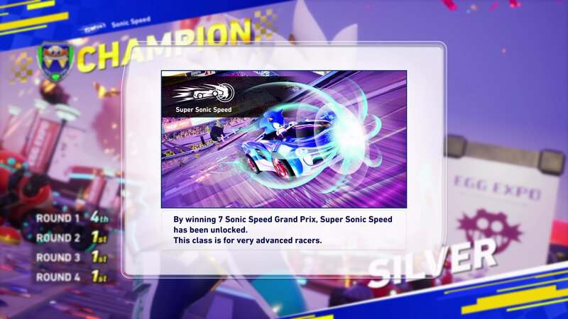 Vous débloquerez la vitesse super sonique en complétant les 7 courses du Grand Prix à la vitesse de Sonic. Vous devrez compléter les 6 premiers Grand Prix pour déverrouiller le Grand Prix des Eggs. En battant ce Grand Prix avec n'importe quel personnage, vous débloquerez une vitesse super sonore.